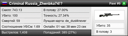 | de_mirage | 21 | 2.33 | 0.84 | 1 | 16 | 00:25:04 | 11.06.2016 | |