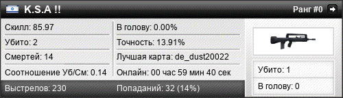 | de_aztec2 | 0 | 0.00 | 0.00 | 3 | 6 | 00:08:55 | 30.10.2015 | |