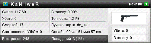 | 20.06.2016 @ 12:39 - 12:42 | de_aztec | 00:02:15 | 0 | 0 | 0 | 0.00% | 0.00% | 115.43 |