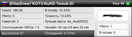 | de_dust20022 | 3 | 1.50 | 0.88 | 1 | 2 | 00:03:25 | 21.06.2016 | |