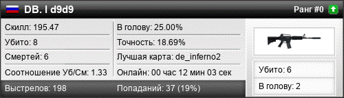 | de_inferno2 | 8 | 1.33 | 0.66 | 1 | 7 | 00:12:03 | 25.06.2016 | |