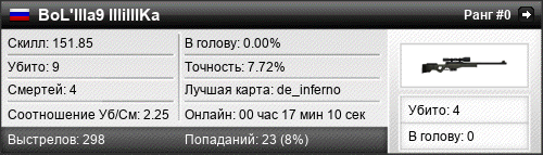 | de_inferno | 9 | 2.25 | 0.52 | 1 | 10 | 00:17:10 | 04.11.2015 | |