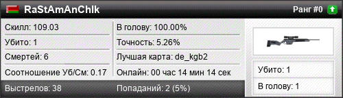 | 23.05.2019 @ 01:47 - 01:49 | de_westwood | 00:02:03 | 0 | 1 | 0 | 0.00% | 0.00% | 97.99 |