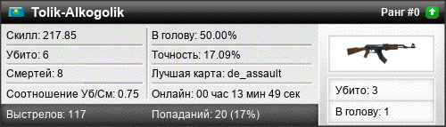 | de_assault | 6 | 2.00 | 0.86 | 1 | 5 | 00:06:59 | 11.07.2016 | |