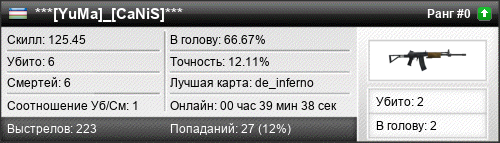 | de_inferno | 6 | 1.00 | 0.48 | 2 | 8 | 00:12:34 | 14.07.2016 | |