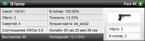 | de_dust2 | 1 | 0.50 | 0.26 | 0 | 3 | 00:03:51 | 01.01.1970 | |