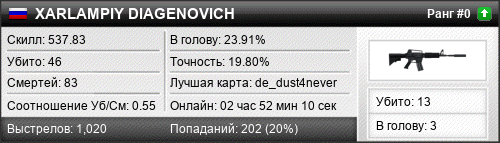 | de_dust4never | 15 | 0.79 | 0.28 | 2 | 36 | 00:53:39 | 16.07.2016 | |