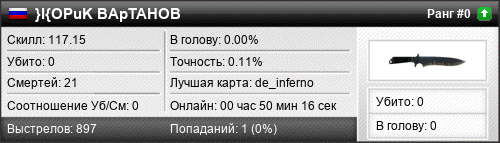 | de_inferno | 0 | 0.00 | 0.00 | 1 | 4 | 00:03:27 | 14.08.2016 | |