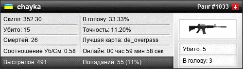22.07.2016 @ 14:19 - 14:35 de_kgb 00:15:33 2 7 1 50.00% 4.61% 132.92 Разница: +32.03