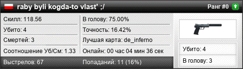 | de_inferno | 4 | 1.33 | 0.87 | 0 | 3 | 00:04:36 | 01.01.1970 | |