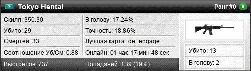 | 07.04.2016 @ 22:01 - 22:16 | de_engage | 00:15:01 | 12 | 8 | 1 | 8.33% | 21.50% | 325.18 |