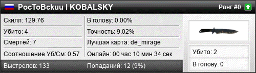 | de_mirage | 2 | 0.67 | 0.36 | 1 | 4 | 00:05:36 | 22.07.2016 | |