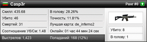 | de_inferno2 | 21 | 3.00 | 0.79 | 1 | 17 | 00:26:41 | 25.07.2016 | |