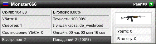 | 31.07.2016 @ 22:12 - 22:13 | de_westwood | 00:01:23 | 0 | 0 | 0 | 0.00% | 0.00% | 100.00 |