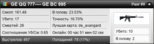 | de_avangard | 7 | 0.70 | 0.42 | 1 | 12 | 00:16:40 | 06.11.2015 | |