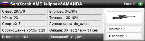 | de_aztec | 23 | 3.29 | 1.62 | 3 | 11 | 00:14:13 | 15.11.2016 | |