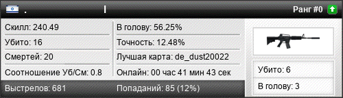 | de_dust20022 | 12 | 1.71 | 0.61 | 1 | 13 | 00:19:37 | 11.08.2016 | |