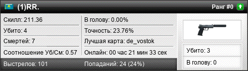 | 07.11.2015 @ 04:06 - 04:08 | de_avangard | 00:01:22 | 0 | 0 | 0 | 0.00% | 0.00% | 95.00 |