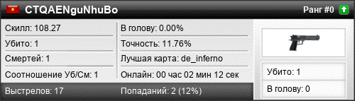 | de_inferno | 1 | 1.00 | 0.45 | 1 | 1 | 00:02:12 | 17.08.2016 | |