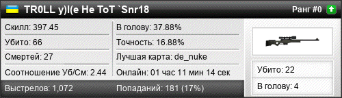 | de_nuke | 26 | 3.71 | 1.04 | 1 | 15 | 00:25:06 | 20.08.2016 | |