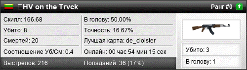 | 26.08.2016 @ 03:20 - 03:50 | de_shorty | 00:30:05 | 0 | 1 | 0 | 0.00% | 9.52% | 94.94 |