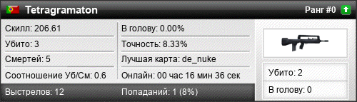 13.09.2016 @ 00:19 - 00:20 de_nuke 00:00:42 2 1 0 0.00% 0.00% 206.61 Разница: +97.76