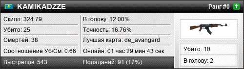 | de_dust2 | 8 | 1.14 | 0.37 | 2 | 13 | 00:21:23 | 31.08.2016 | |