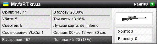 | de_inferno | 5 | 1.00 | 0.40 | 1 | 8 | 00:12:30 | 02.09.2016 | |
