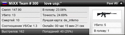 | de_inferno | 13 | 1.30 | 0.85 | 2 | 11 | 00:15:21 | 21.10.2015 | |