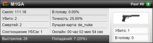 | de_nuke | 2 | 1.00 | 0.75 | 1 | 2 | 00:02:41 | 04.09.2016 | |