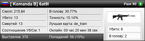 | de_mirage | 4 | 1.00 | 0.62 | 2 | 6 | 00:06:28 | 08.09.2016 | |