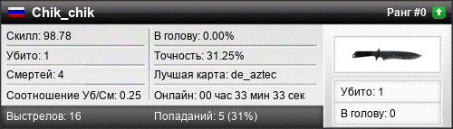 | 12.09.2016 @ 07:54 - 07:58 | de_aztec | 00:03:46 | 1 | 2 | 0 | 0.00% | 42.86% | 104.04 |