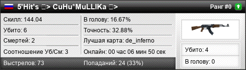 | de_inferno | 6 | 3.00 | 0.88 | 1 | 4 | 00:06:50 | 14.09.2016 | |