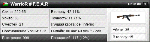 | de_inferno | 38 | 1.81 | 0.76 | 2 | 31 | 00:49:52 | 08.11.2015 | |