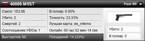 | de_inferno | 2 | 2.00 | 3.00 | 1 | 0 | 00:00:40 | 21.10.2015 | |