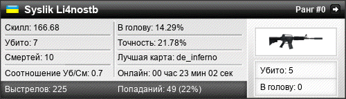 | de_inferno | 6 | 1.20 | 0.42 | 1 | 8 | 00:14:13 | 08.11.2015 | |