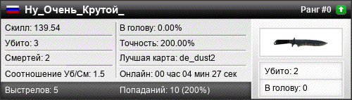 | de_dust2 | 3 | 1.50 | 0.67 | 2 | 4 | 00:04:27 | 24.09.2016 | |