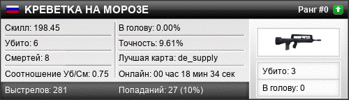 25.09.2016 @ 00:15 - 00:29 de_supply 00:14:20 6 5 0 0.00% 10.67% 198.60 Разница: +96.60