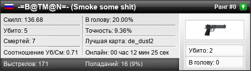| de_dust2 | 3 | 0.75 | 0.48 | 2 | 4 | 00:06:17 | 25.09.2016 | |