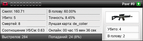 | 30.04.2019 @ 01:23 - 01:31 | de_office | 00:08:30 | 5 | 3 | 2 | 40.00% | 7.29% | 160.71 |