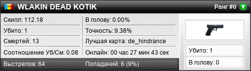 | 26.09.2016 @ 14:32 - 14:51 | de_hindrance | 00:19:26 | 1 | 13 | 0 | 0.00% | 9.38% | 112.18 |