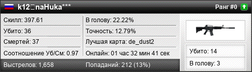 | 14.10.2016 @ 04:43 - 04:47 | de_inferno | 00:04:02 | 0 | 1 | 0 | 0.00% | 7.14% | 174.87 |