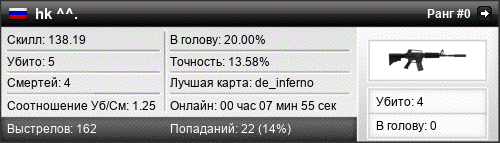 | de_inferno | 5 | 1.25 | 0.63 | 1 | 5 | 00:07:55 | 09.11.2015 | |