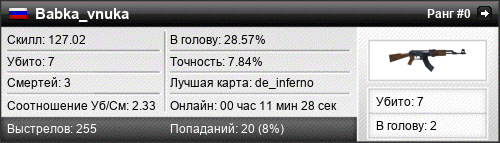 | de_inferno | 7 | 2.33 | 0.61 | 1 | 7 | 00:11:28 | 09.11.2015 | |