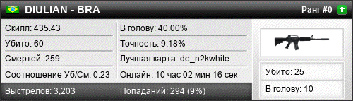 | 16.10.2016 @ 11:47 - 11:54 | de_inferno | 00:07:11 | 1 | 3 | 1 | 100.00% | 12.77% | 427.01 |