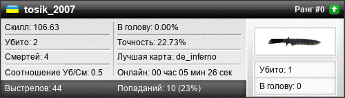 | de_inferno | 1 | 1.00 | 0.69 | 1 | 1 | 00:01:27 | 09.11.2015 | |