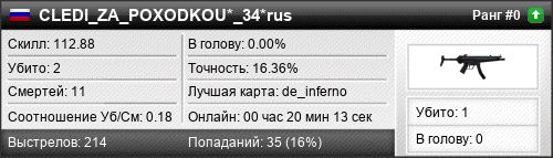 | de_dust2 | 0 | 0.00 | 0.00 | 1 | 5 | 00:09:02 | 16.10.2016 | |