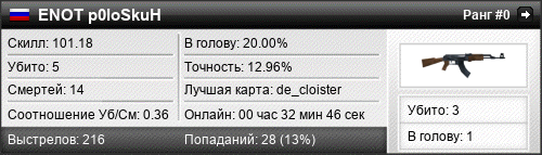 | de_dust2 | 1 | 0.33 | 0.14 | 1 | 4 | 00:07:12 | 23.10.2015 | |