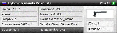 | de_inferno | 1 | 1.00 | 1.82 | 0 | 0 | 00:00:33 | 01.01.1970 | |