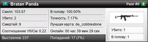 | de_cobblestone | 2 | 0.67 | 0.25 | 1 | 5 | 00:07:55 | 01.11.2016 | |